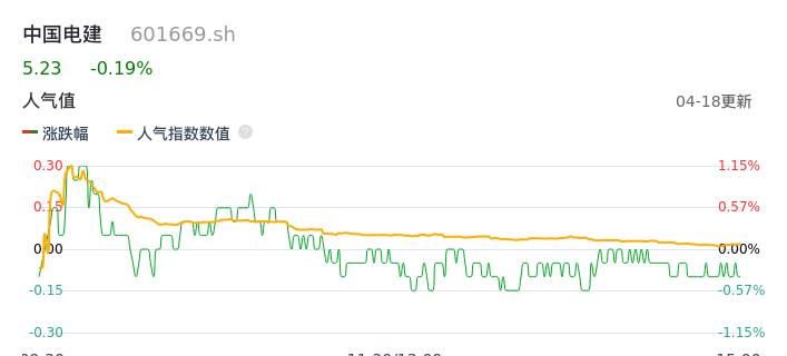 04月18日,中国电建收报5.23,股价涨幅-0.19%,成交金额9.38亿元,换手率1.37%。