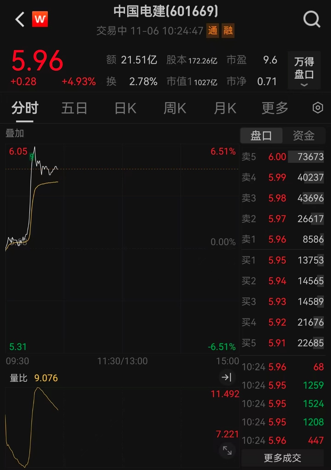 上证报中国证券网讯11月6日,中国电建开盘后拉升,截至10点42分,中国电建报5.96元/股,上涨4.93%。