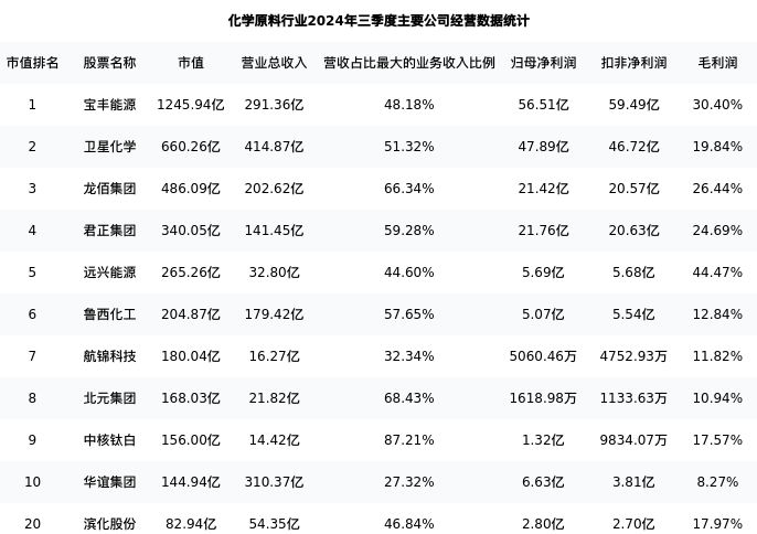 滨化股份最新报告期数据为三季度,下表汇总了化学原料行业内市值靠前的公司三季度主要经营数据