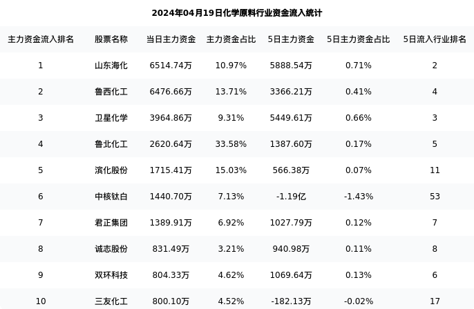 从主力资金流向来看,化学原料行业今日主力资金流入24.27亿元,在所有申万二级行业中排名:92/131。