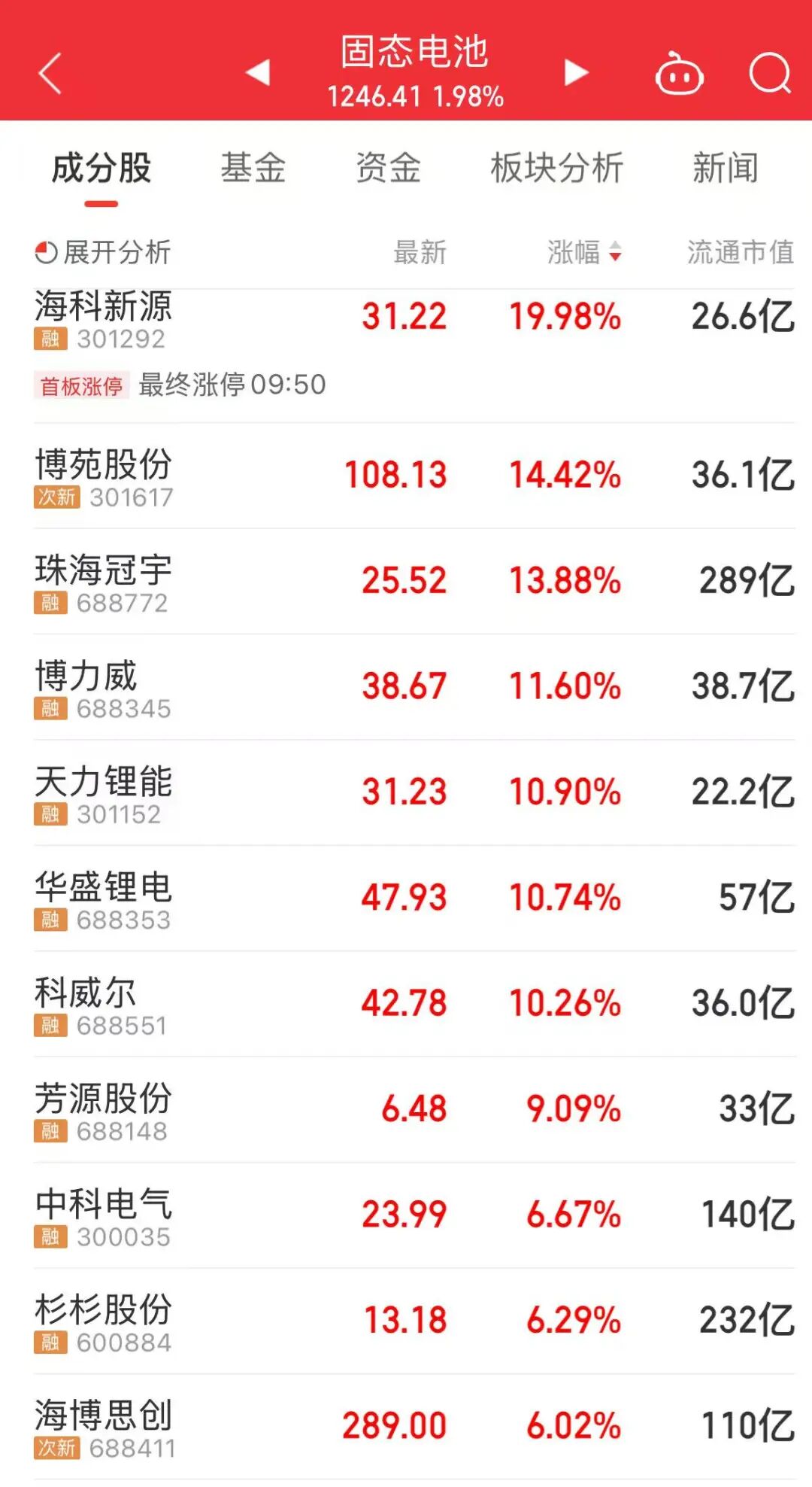 今天上午,固态电池板块上涨,海科新源、珠海冠宇、华盛锂电等个股大涨。