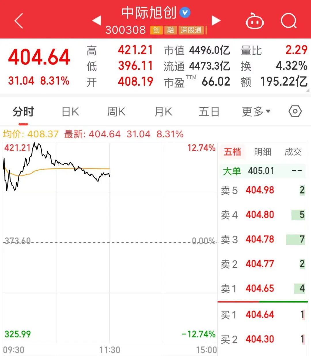 科技股反弹,“易中天”(新易盛、中际旭创、天孚通信)、“纪连海”(寒武纪、海光信息、工业富联)集体上涨。其中,中际旭创上涨8.31%,最新市值为4496亿元,成交额为195.22亿元,居A股第一。