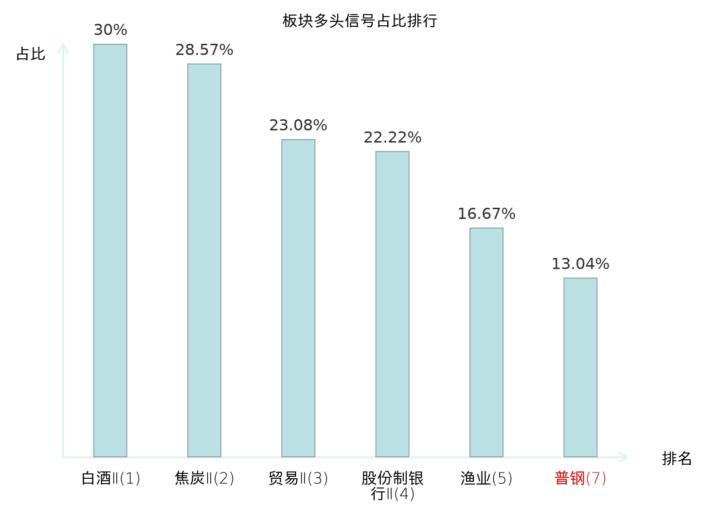 全市场所有行业板块中主力多头信号占比排名中,白酒Ⅱ板块位居第一。焦炭Ⅱ板块名次提升最快,较昨日上升119位。