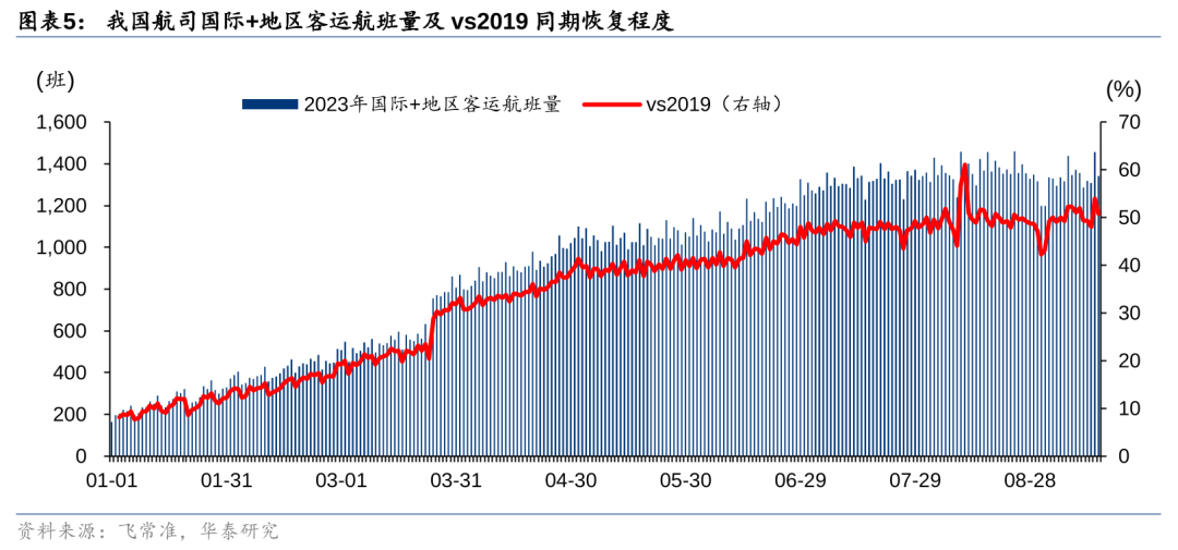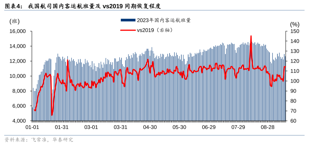 9月民航进入淡季,航班量等高频数据出现回落。根据飞常准数据,9月截至16日我国航司日均执飞13806班,恢复至2019年同期93.3%,相比7-8月暑运的恢复程度下降8.3pct,其中国内/国际+地区分别恢复至103.0%/49.5%,相比7-8月暑运的恢复程度分别-9.8/+0.8pct。不过中秋国庆假期旺盛需求有望延续,体现其韧性。根据民航局预测,中秋国庆小长假日均保障国内客运航班约14000班、运输国内旅客196万人次,分别比2019年国庆假期增长18%、17%。我们认为民航供需改善的逻辑将持续被验证,为中长期盈利中枢提升奠定基础。