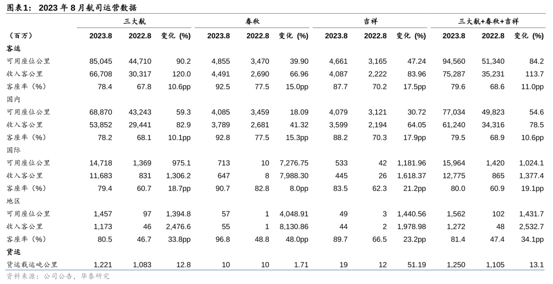 据民航局数据,8月旅客运输规模再创历史新高,行业旅客运输量6396.4万人次,较2019年同期增长4.5%。其中国内航线旅客运输量超过19年同期11.2%;国际航线旅客运输量恢复至19年同期52.0%。行业需求旺盛带动三大航运营进一步提升,三大航整体供/需恢复至2019年同期106%/97%(7月为104%/99%),环比上升1.8%/2.0%,客座率78.4%,环比上升0.2pct,不过相比19年同期仍低6.9pct。