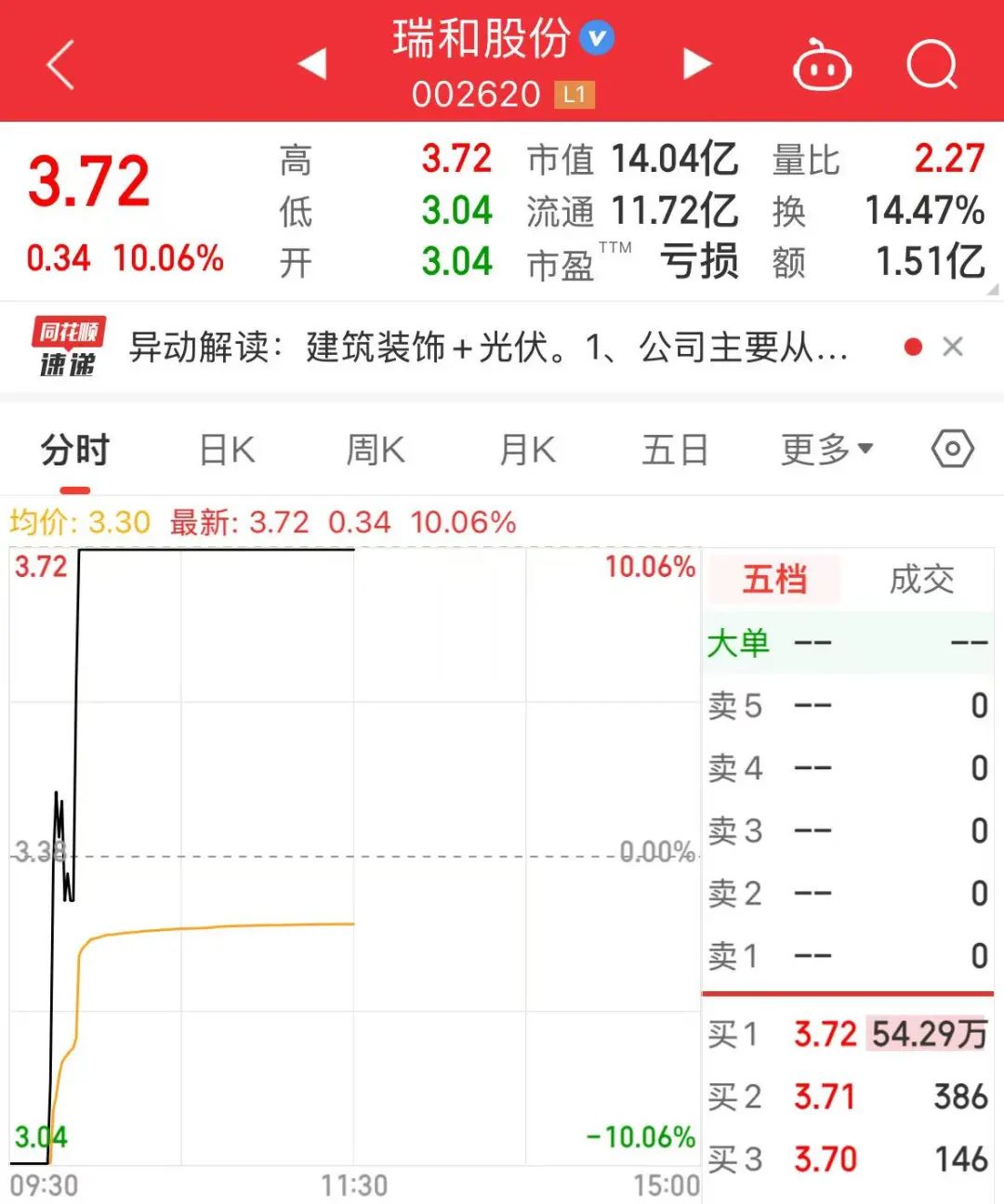 2只低价股早盘上演“地天板”走势。瑞和股份开盘跌停,盘中约9时42分股价由跌停板瞬间拉升,于9时53分封住涨停板,该股最新股价3.72元/股,此前2个交易日均遭遇跌停。