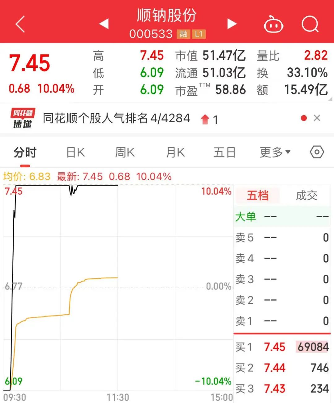 顺钠股份开盘同样跌停,约9时36分股价由跌停板直线拉升,约9时42分股价涨停,盘中短暂开板后回封,最新股价7.45元/股。该股昨日盘中上演“过山车”,股价一度触及涨停,收盘时跳水,跌幅达到7.77%。自去年12月26日以来的8个交易日内,顺钠股份已收获7个涨停板。