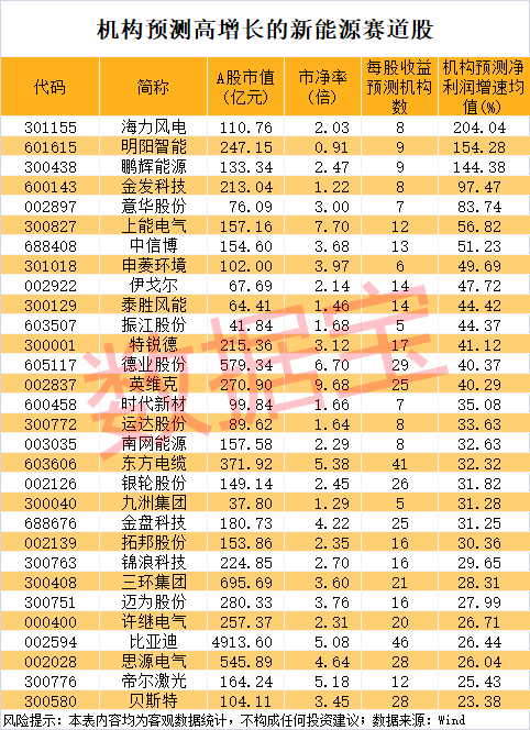 3只概念股获机构一致预测净利润增速均值在100%以上,分别是海力风电、明阳智能、鹏辉能源。