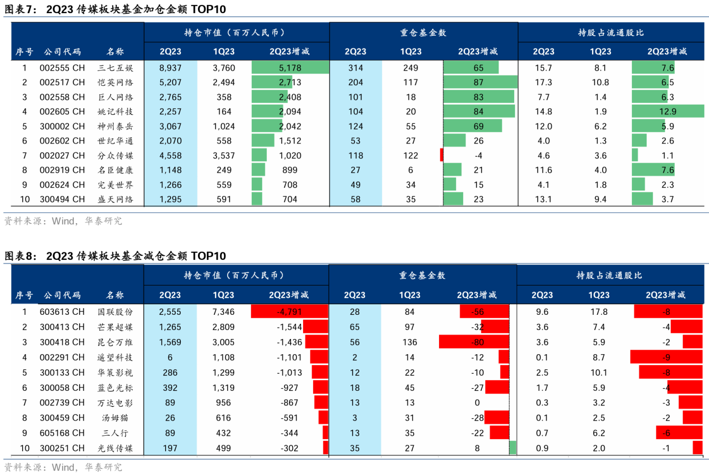 23Q2重仓基金数量Top5的传媒公司为:三七互娱、恺英网络、神州泰岳、分众传媒、姚记科技;重仓基金数量新进入Top20的包括巨人网络、名臣健康、冰川网络、中文传媒、 紫天科技。营销龙头分众传媒基金重仓增持超10亿。23Q2基金增持传媒市值Top5分别为:三七互娱、恺英网络、巨人网络、姚记科技、神州泰岳,持股环比增加均超过20亿。