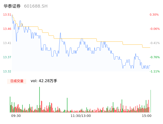 04月23日,华泰证券收报13.32,股价涨幅-1.11%,成交金额5.66亿元,换手率0.58%。