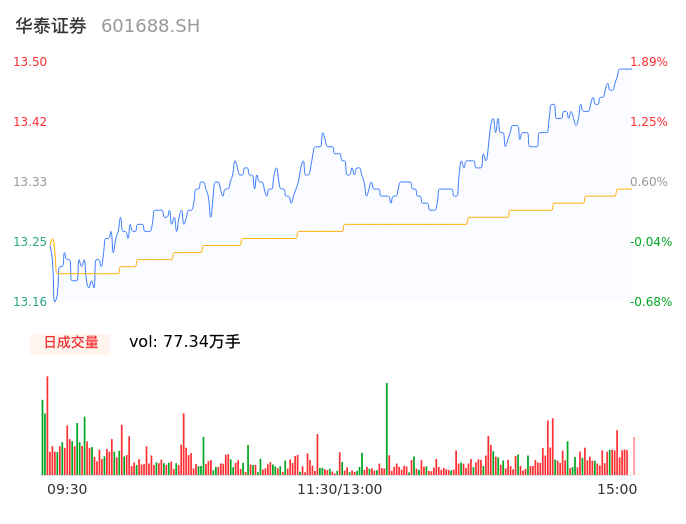 04月17日,华泰证券收报13.50,股价涨幅1.89%,成交金额10.30亿元,换手率1.06%。