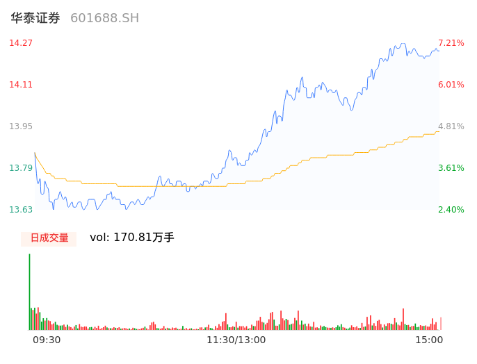 04月26日,华泰证券收报14.24,股价涨幅6.99%,成交金额23.79亿元,换手率2.35%。