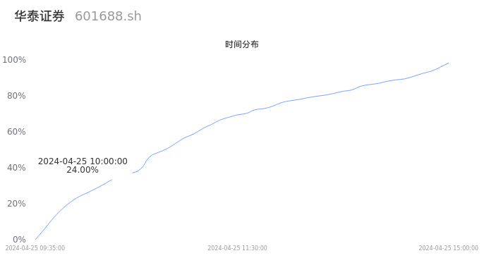 601688华泰证券2024年04月25日成交46.59万手,成交金额6.18亿元,相较昨日放量1.94万手,换手率0.64%,成交清淡。