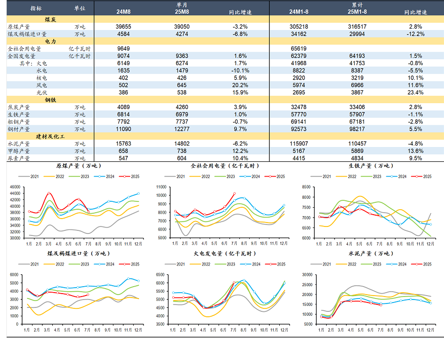 煤炭产量上,因为限制超产,7月原煤产量同比首次出现负增长,创下2024年5月以来新低,显示供应端已出现收缩迹象,这一趋势在三四季度可能进一步强化。