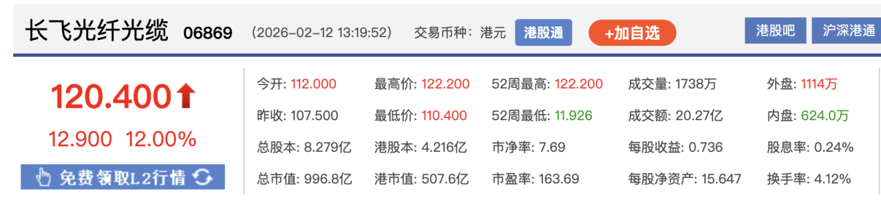 港股异动 | 长飞光纤光缆一度涨超13% 股价创新高