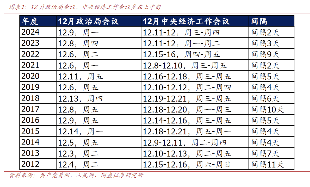 1、12月政治局会议历来是中央经济工作会议的吹风会,且大多间隔在一周内,次年经济工作基调和总体部署也就此确定。节奏上,每年4/7/10/12月的季度政治局会议(10月可能不开)均围绕经济,也是决定后续政策方向的关键会议。其中,12月政治局会议定调次年,随后中央经济工作会议据此进一步部署、篇幅也更长。