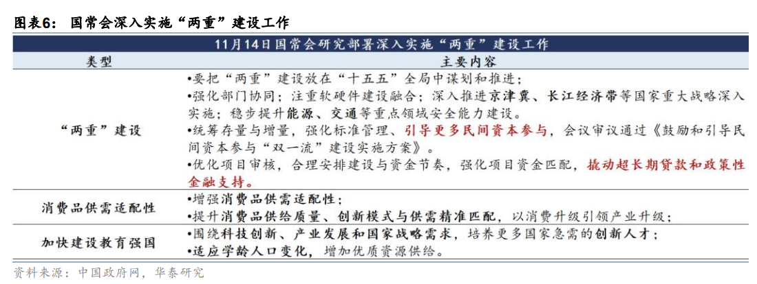 4)扩基建,“抓紧、抓好、用好”民生类投资和“两重”建设,扩大有效投资,关注后续“十五五”重大项目清单,如水利基建(水电、运河等)、科技(产业融合)、民生(“投资于人”)等新项目部署。近期11.14国常会已部署深入实施“两重”建设工作,要求把“两重”建设放在“十五五”全局中谋划和推进,突出“战略性、前瞻性、全局性”。2026年应会继续抓好、用好“两重”建设,“投资于人”要求下,也会侧重民生类投资。此外,“十五五”规划纲要全文应也会明确新一批重大项目“清单”,包括具体数量和领域(如“十四五”规划列明102项重大项目),将指明后续政策、资金等资源的重点支持方向。发改委发文《高质量做好“十五五”规划编制工作》中指出,重点聚焦“新质生产力发展、重大基础设施建设、城乡区域协调、绿色低碳转型、重点领域安全保障、解决人民群众急难愁盼问题”等领域,提出一批重大工程项目。
