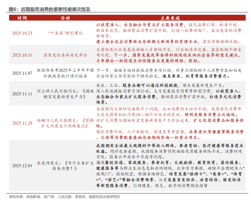 6)促改革、防风险,应会更为突出“十五五”新部署和“划重点”,包括新质生产力、要素市场化、“投资于人”、稳楼市、稳股市等。重点关注:1)建设强大国内市场、加快构建高水平社会主义市场经济体制,如延续“反内卷”,加快完善要素市场化配置体制机制,也可关注“编制宏观资产负债表、全面摸清存量资源资产底数、优化资产负债结构”等新部署的实际动作;2)“一老一小”,发挥育儿补贴、个税抵扣等政策的综合作用,优化基本养老服务供给,优化就业、社保等方面的年龄限制政策,积极开发老年人力资源,发展银发经济;3)稳股市,央行、证监会在学习二十届四中全会精神时有细化跟进,包括央行“维护股市、债市、汇市等金融市场平稳运行”,证监会“进一步深化投融资综合改革,持续增强我国资本市场的包容性、适应性和吸引力、竞争力”。