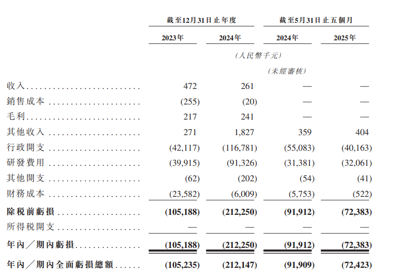 财务方面,于2023年度、2024年度,华芢生物实现收入分别约为47.2万元、26.1万元人民币;于2023年度、2024年度、2024年及2025年截至5月31日止五个月,年/期内全面亏损总额分别为1.05亿元、2.12亿元、9190.9万元、7242.3万元人民币。