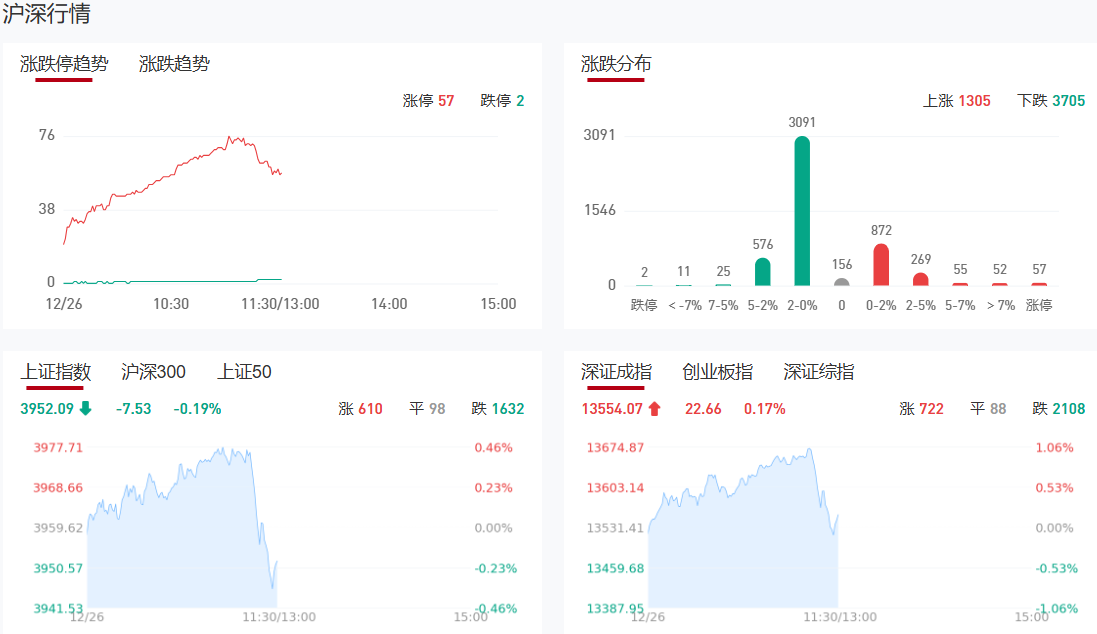 市场早盘冲高回落,三大指数盘中集体跳水翻绿。沪深两市半日成交额1.45万亿,较上个交易日大幅放量2513亿。盘面上热点快速轮动,全市场超3900只个股下跌。从板块来看,锂电产业链快速走强,天际股份4天3板,宏源药业、永兴材料等多股涨停。商业航天概念反复活跃,神剑股份7连板,九鼎新材4连板,佳缘科技、中超控股涨停。光伏概念局部拉升,协鑫集成、亿晶光电涨停。海南自贸概念表现活跃,海南发展6天5板。下跌方面,算力硬件概念表现较弱,长光华芯跌超10%。