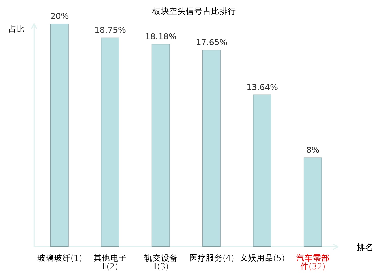 全市场所有行业板块中主力空头信号占比排名中,玻璃玻纤板块位居第一。医疗服务板块名次提升最快,较昨日上升126位。