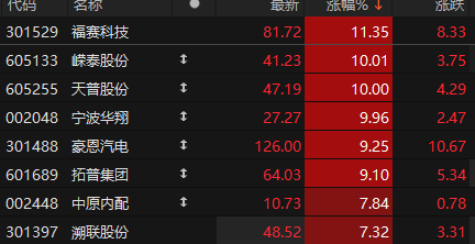 上证报中国证券网讯 8月29日上午交易时段,汽车板块震荡走强。截至10时38分,嵘泰股份、天普股份、宁波华翔涨停。福赛科技涨超11%,豪恩汽电、拓普集团涨逾9%。