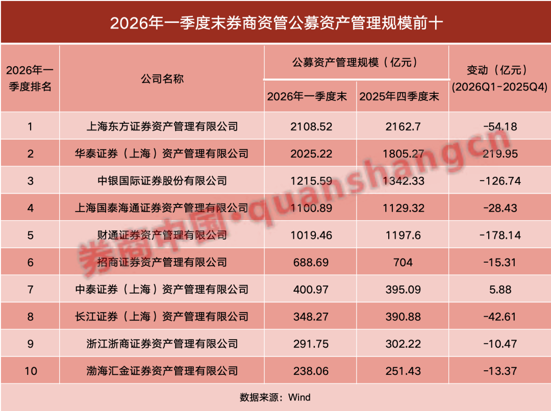 近期,随着公募基金2026年一季报披露完毕,券商资管的最新公募管理规模也浮出水面。