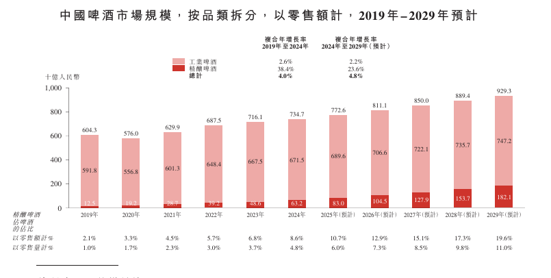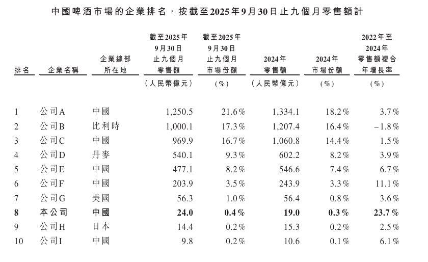 截至2025年9月30日止九个月,公司为中国啤酒行业第八大企业,中国第五大的本土啤酒企业。从增长表现来看,以2022年至2024 年零售额复合年增长率计,公司是中国啤酒行业前十大企业中增长最快的企业,零售额复合年增长率为23.7%。
