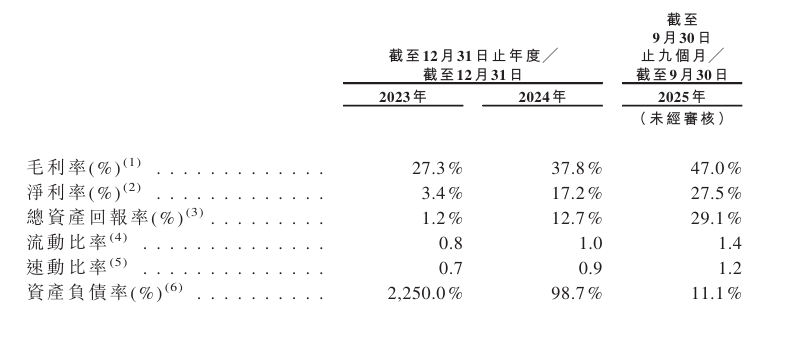 公司于2023年、2024年、2025年截至9月30日止九个月,毛利率分别为27.3%、37.8%、47%。