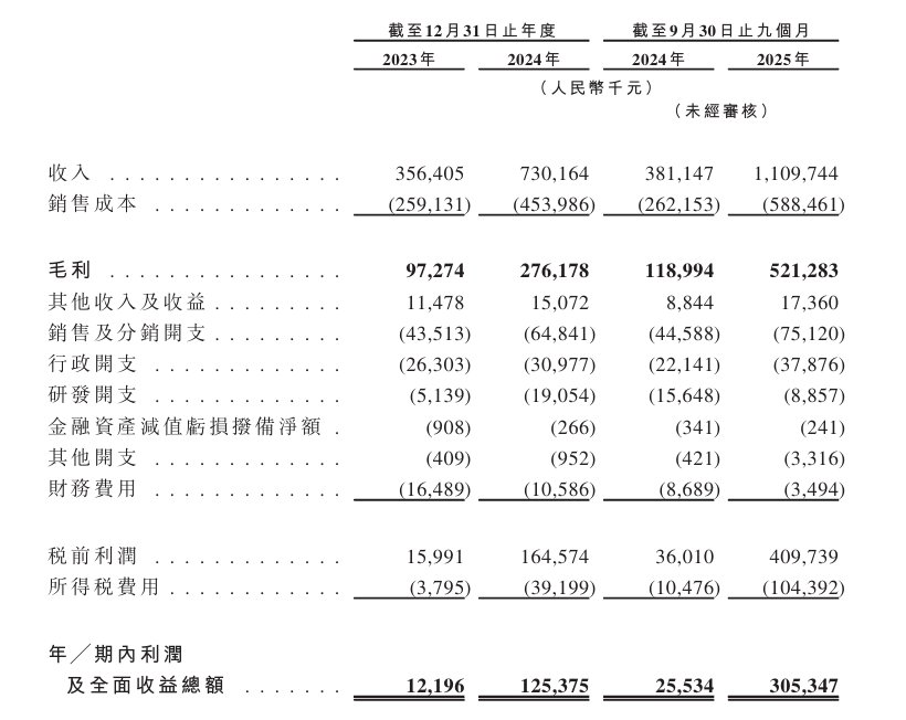 公司于2023年、2024年、2025年截至9月30日止九个月,收入分别约为3.56亿元、7.3亿元、11.1亿元人民币。