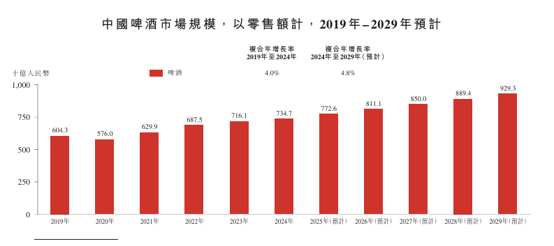 以零售额计,中国啤酒市场规模已从2019年的人民币6,043亿元增长至2024年的人民币7,347亿元,复合年增长率为 4.0%。预计未来五年将延续稳健增长趋势,至2029年市场规模将达人民币9,293亿元,2024年至2029年复合年增长率进一步提升至4.8%。