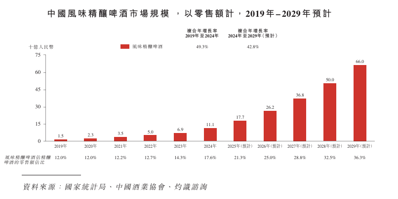 以零售额计,中国风味精酿啤酒市场规模从 2019年的人民币15亿元快速增长至2024年的人民币111亿元,2019年至2024年复合年增长率高达49.3%;预计至2029年将进一步扩大至人民币660亿元,2024年至2029年的预期复合年增长率为42.8%。
