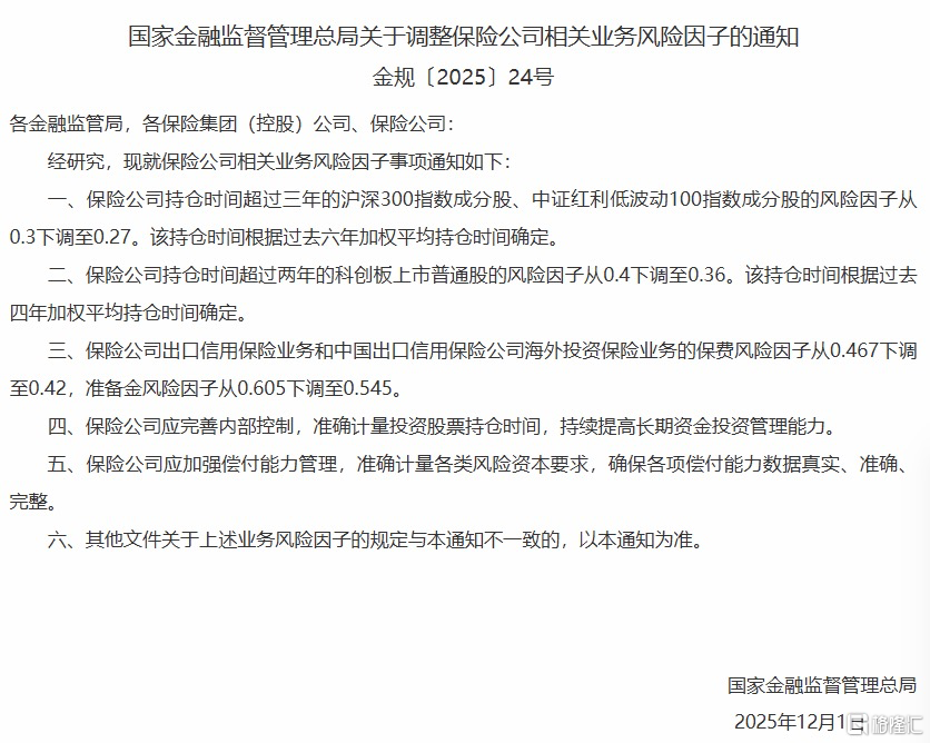 12月5日,A股收盘后,国家金融监管总局发布《关于调整保险公司相关业务风险因子的通知》,再次调低沪深300指数、中证红利低波动100指数、科创板成分股的风险因子: