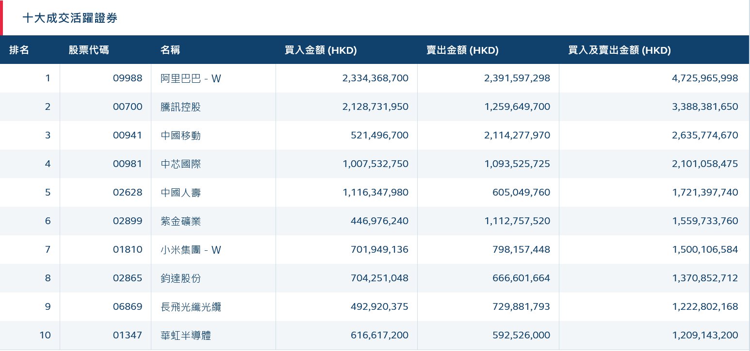 此外,钧达股份(02865)获净买入3764万港元,而中国移动(00941)遭净卖出11.47亿港元。