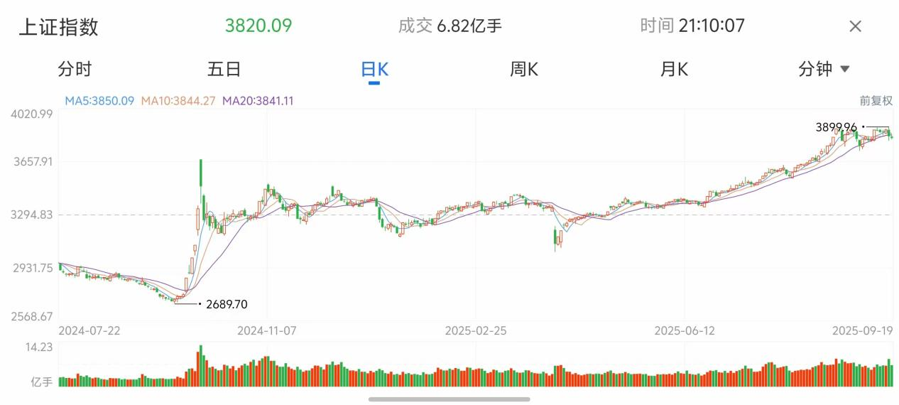 随后市场经历震荡波动、外部风险扰动,但受益于政策持续发力,最终再度回稳抬升,沪指一度在9月18日触及历史高位3899.96点。截至2025年9月19日收盘,自9.24启动以来,上证指数累计上涨38.97%,深证成指、创业板指、科创50分别上涨61.7%和102%、111.9%。