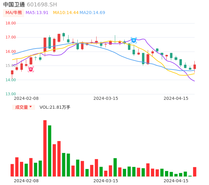 04月15日,中国卫通收报15.07,股价涨幅2.31%,成交金额3.28亿元,换手率0.52%。