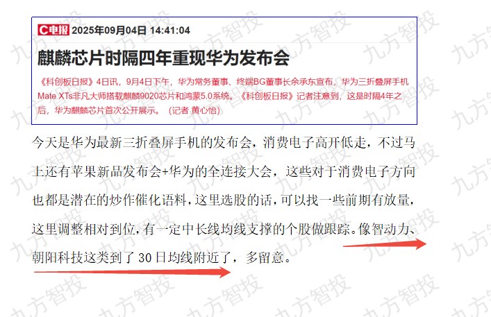 消费电子板块也是一样,板块反弹力度一般,虽然还没有板块的集体效应,主要还是个股机会先行。我们9月4日复盘说的消费电子板块2只票,朝阳科技智动力,皆有不错的表现,虽然没有固态电池,机器人动辄涨停的猛劲,但是胜在一个位置稳健,2只票阶段也有6%+的空间,而且消费电子板块的行情华为、苹果重磅会议还没开始,后续还会脉冲的机会,因此可以继续关注。