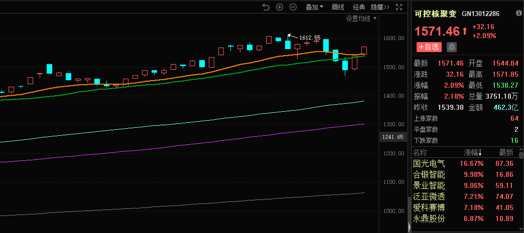 可控核聚变下午震荡走强,但是明显短线的活跃资金的力度并不是很强,就一个合锻智能涨停,国光电气年线位置拔起长阳,而且放巨量,这个位置基本可以看作是一个底部止跌的信号,但上方套牢筹码还是有不少的因此短期想要连续的走强概率不大,如果做中长线的的话,这个位置回踩82下方还是可以多留意低吸机会,另一个趋势止跌的哈焊华通也还可以,不破30位置的话,也可以考虑跟踪。
