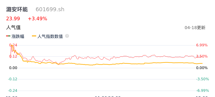 04月18日,潞安环能收报23.99,股价涨幅3.49%,成交金额14.85亿元,换手率2.06%。