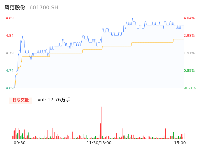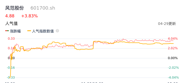 04月29日,风范股份收报4.88,股价涨幅3.83%,成交金额8573.11万元,换手率1.55%。