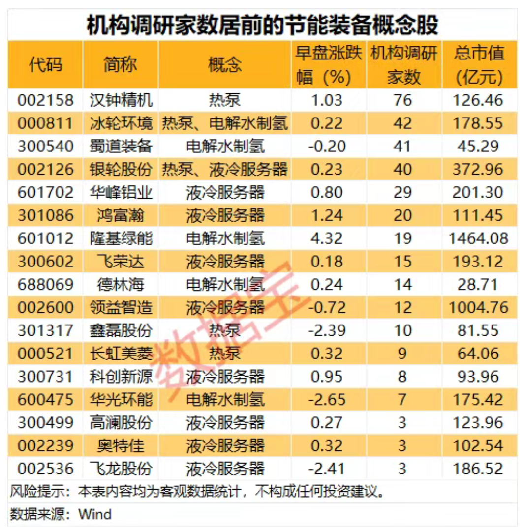 据证券时报·数据宝统计,A股市场中布局热泵、液冷服务器、水电解制氢装备三大节能装备的个股超过80只,早盘38股实现上涨,阳光电源苏州天脉迪森股份涨幅居前,均超过7%。