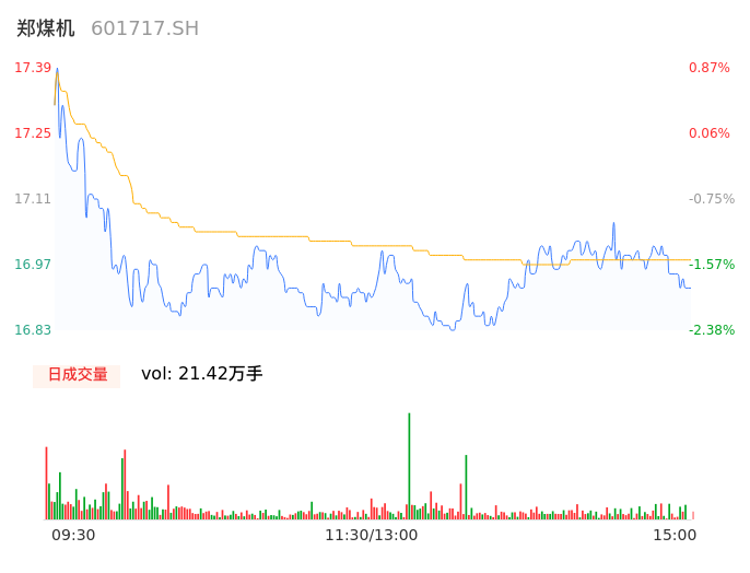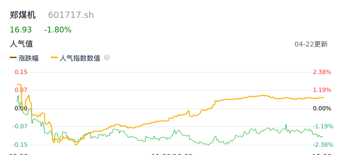 04月22日,郑煤机收报16.93,股价涨幅-1.80%,成交金额3.64亿元,换手率1.40%。