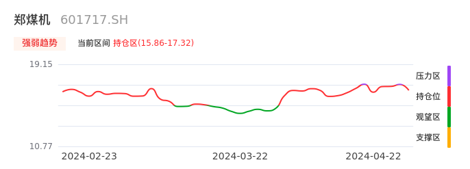 我们来看一下该股的九方特色指标强弱趋势的情况:郑煤机近日从压力区回到持仓区。股价快速拉升后出现持续调整。后续主要关注下方支撑位:15.86元是否能启稳回升。