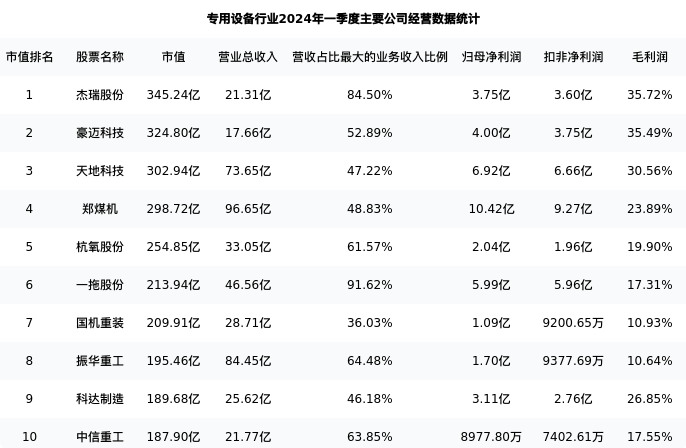 郑煤机最新报告期数据为一季度,下表汇总了专用设备行业内市值靠前的公司一季度主要经营数据