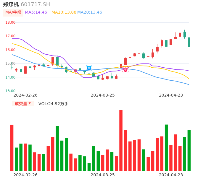 04月23日,郑煤机收报16.23,股价涨幅-4.13%,成交金额4.09亿元,换手率1.63%。