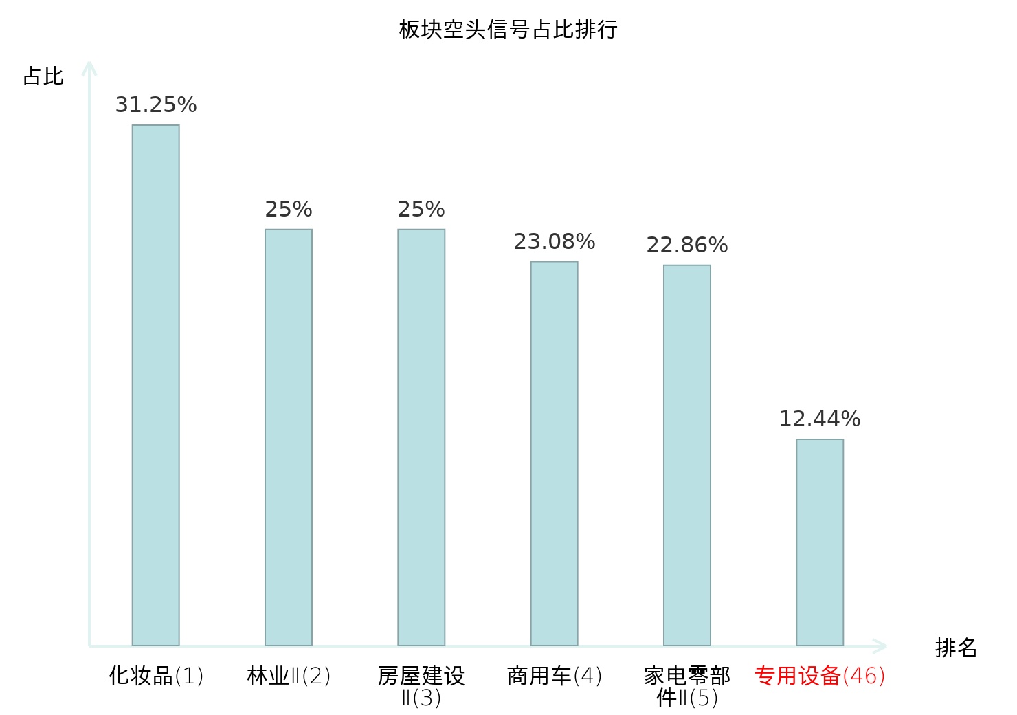 全市场所有行业板块中主力空头信号占比排名中,化妆品板块位居第一。房屋建设Ⅱ板块名次提升最快,较昨日上升113位。