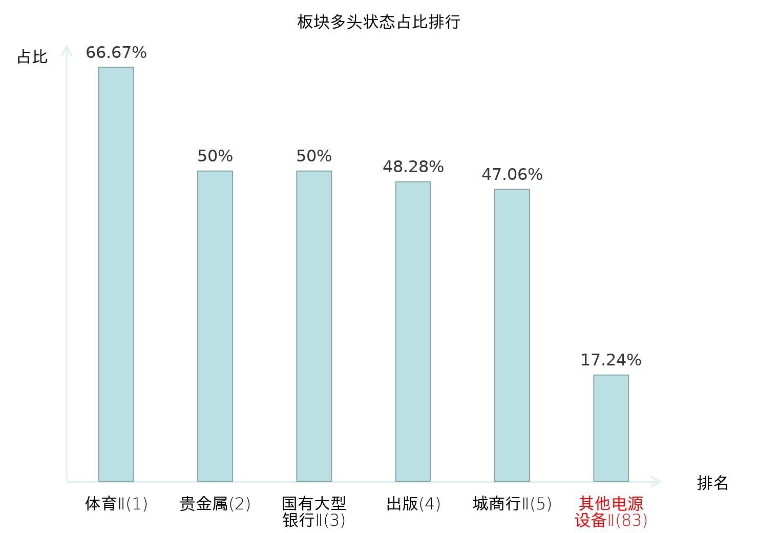 全市场所有行业板块中主力多头状态占比排名中,体育Ⅱ板块位居第一。电子化学品Ⅱ板块名次提升最快,较昨日上升78位。
