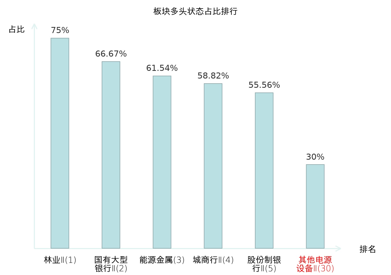 全市场所有行业板块中主力多头状态占比排名中,林业Ⅱ板块位居第一。专业连锁Ⅱ板块名次提升最快,较昨日上升63位。