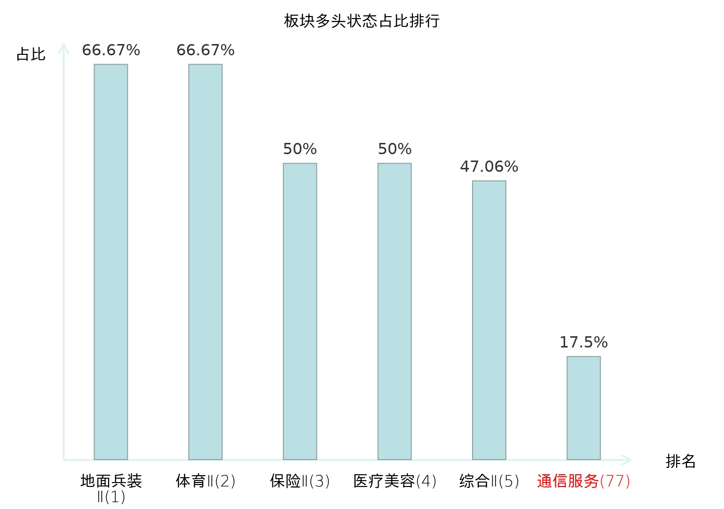 全市场所有行业板块中主力多头状态占比排名中,地面兵装Ⅱ板块位居第一。保险Ⅱ板块名次提升最快,较昨日上升82位。