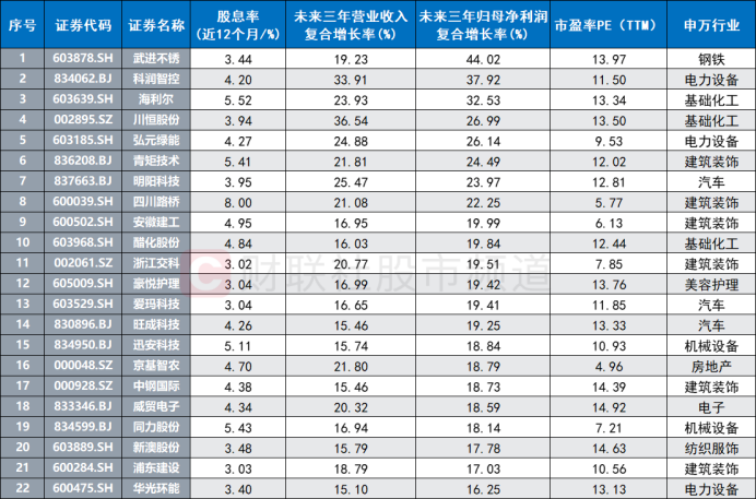 注:近12个月的股息率高于3%、未来三年营收及归母净利润增速均超15%、市盈率小于15倍的个股(截至9月14日收盘)